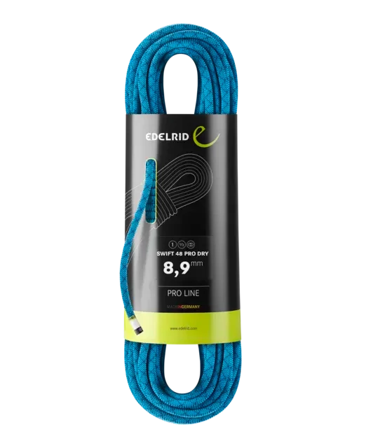 One rope, three standards. The SWIFT is a single, double, and twin rope in one—plus with a diameter of 8.9 mm one of the thinnest single ropes on the market. Thanks to being made on a braiding machine with 48 bobbins, the SWIFT 48 Pro Dry has a particularly fine sheath structure that offers very pleasant handling while also being extremely abrasion resistant.