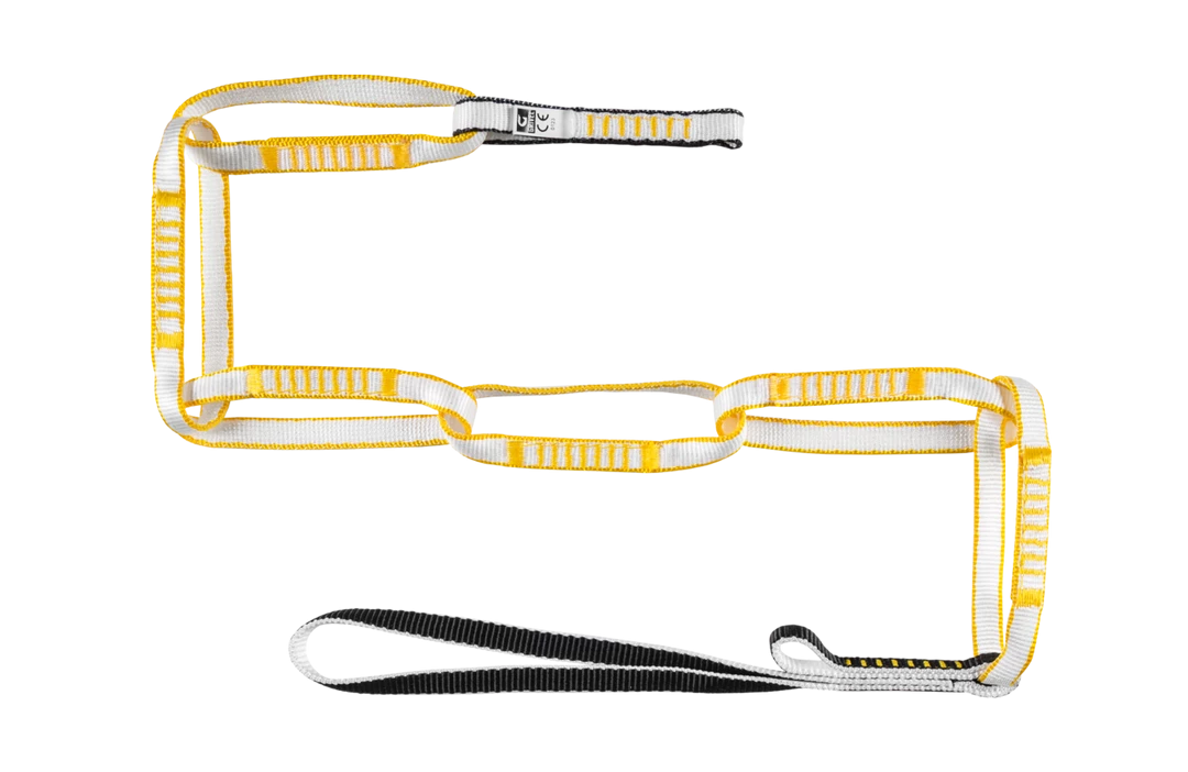 Grivel Daisy Chain Evo has a special construction created to support 23kn of strength for each loop, eliminating the possible risks from dangerous maneuvers. Safety is thus increased compared to a traditional construction, while maintaining versatility and practicality. It can be used for connections or equalization of belays, or to belay, or as a lanyard for rappelling or as a etrier. New construction with the possibility of fixing to the harness by means of a double (recommended) or single cow hitch. Each loop has sewn ends to facilitate sliding and fluidity. Available single or combined with a Sigma K8G or a Alpha K1N carabiner.
