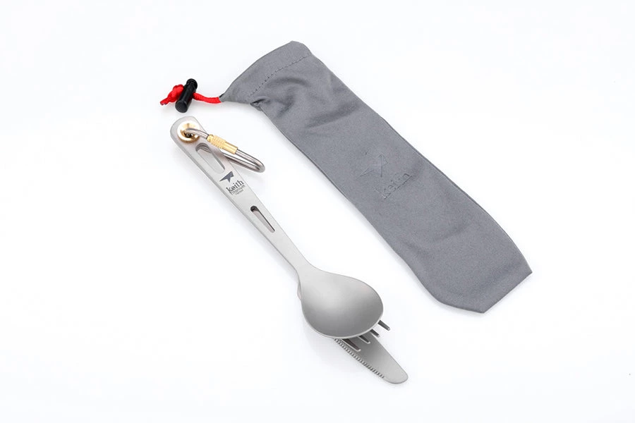 Camping cutlery set made from titanium includes a knife, fork and spoon. Keep them together with the included lightweight carabiner, and keep them clean inside the provided microfibre drawstring bag.