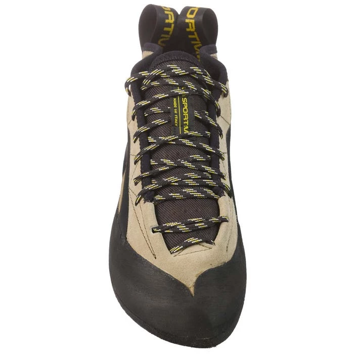 A climbing shoe devised for long mountain routes and cracks: its technical features make this model an complete newcomer to the market! TC Pro guarantees maximum comfort even after several hours thanks to the soft internal padding at the ankle and back. Features include high cut uppers designed to protect the ankle from rubbing against cracks. The front rubber rand offers further protection in the cracks, while the lacing system to the toe has been studded to protect the laces against rock fiction. The uppers and tongue are extremely breathable which enhances comfort. TC Pro uses the P3 patent system, designed to maintain the arched shape of the shoe even after continued use. The sole, made from the new Vibram® compound, reduces deformation on small and sharp cutting holds.