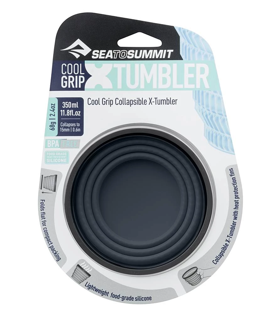 The collapsible Cool Grip X-Mug and X-Tumbler make it easy to handle both hot and cold drinks outdoors. The innovative Cool Grip construction uses specially-designed fins to keep your fingers protected from the heat of your drink—and the rigid rim keeps it sturdy and easy to drink out of. At a generous 480ml, the Cool Grip X-Mug holds almost double the volume of our X-Cup (250ml). And the Cool Grip X-Tumbler holds 350ml—the perfect size for a beer, soda, wine or mixed drink at the end of a long hike. When you’ve drained the last drop, these collapsible cups can be packed away almost anywhere.