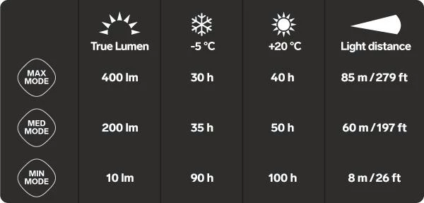 Explore features 400 lumen and three light settings with a super low mode (10 lumen). This light setting gives you even longer burn time and is perfect for reading, close range work and when you want to save the battery. If you want a cozy tent light or boat light, just put the headlamp into the included storage bag and bring on the coziness. Wherever your next adventure takes you and whatever activity you would like to do, Explore 4 will be ready to explore it with you.